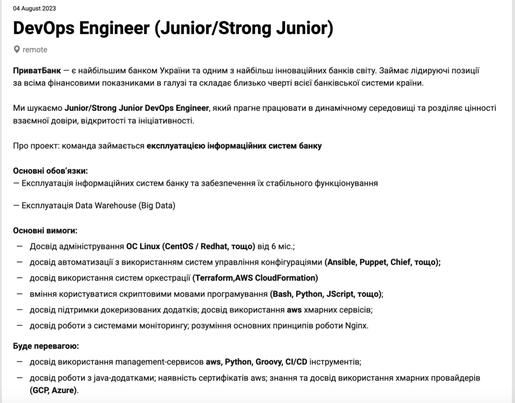 Самомотивація. Не чекати, поки скажуть щось робити, а самостійно знаходити слабкі місця та пропонувати рішення, що можуть їх покращити. DevOps-інженер — це людина, яка завжди рухається вперед.
