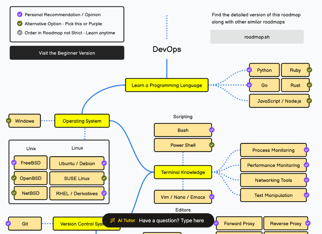 Корисно, якщо важко оцінити, що вже знаєте, а що варто підтягнути. Наприклад, roadmap.sh — зручна візуалізація стека з розбивкою за темами. Добре допомагає структурувати навчання або підготовку до нової ролі.