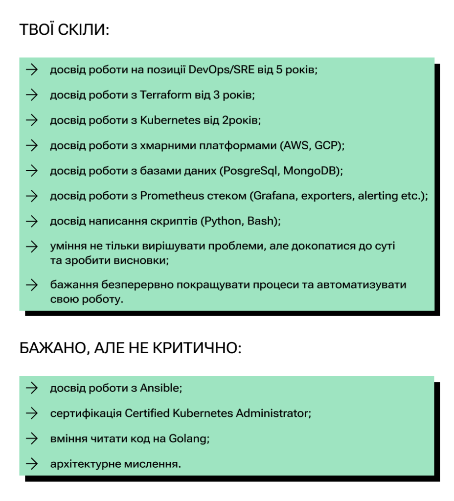 Завдання SRE: моніторинг, алертинг та траблшутинг. Саме тому необхідний скіл — вміти розвʼязувати нетривіальні технічні проблеми. Галузь SRE знаходиться на межі розробки і DevOps, тому від кандидатів не вимагаються поглиблених знань всіх процесів та інструментів.